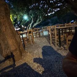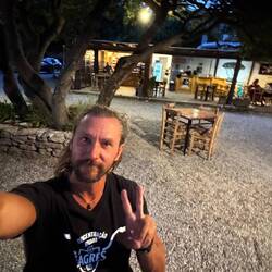 An der Kantine angekommen entscheide ich mich für einen Tisch draußen 2. Reihe zum Strand, eine lustige Entscheidung, wie sich noch rausstellen sollte. Eine sehr natürlich und attraktive Bedienung kommt und fragt nach meinen Besürfnissen. Ich nehme ein Alpha vom Fass, das Knoblauchbrot, Tzatziki, den Tintenfisch und die Anschovis in Marinade. Ein junger Mann bringt das Bier und sie Brot. Noch während ich dort sitze und die Schönheit der Taverne auf Video festhalten will, kommt wie aus dem nichts eine Windböe um die 70km/h und geht das Brot vom Tisch. Sehr lieb und aufmerksam bringt die Bedienung Neues. Ich genieße das dessen und bekomme Melone und Raki auf‘s Haus. Die kleine Flasche Raki sind 6 Shots, also habe ich in Kombination mit dem Bier schon einen drin, da ich ja sonst nichts mehr trinke. Das Essen hat sehr sehr gemundet und ich empfehle die Taverne sehr! Ich kralle mir noch ein Eis aus der Kühltheke, bezahle und schleiche mit dem Handylicht die Offroadstrasse entlang zum Camper! Dort angekommen sind es draußen noch 31 Grad und im Chälli 34, also entscheide ich mich spontan meine erste Nacht in 3 Jahren reisen draußen am Strand zu schlafen. Gesagt, getan nehme ich ein kühle Flasche Wasser aus dem Kühlschrank + die Yogamatte samt Handtuch zum Auslegen und das große Outdoorkissen aus der Garage und suche mit der Handylampe eine geeignete Stelle Nähe dem Camper mit Windschutz. Unter dem Baum direkt neben dem Chälli werde ich fündig. Ich lasse mich nieder und schaue auf dem Handy. Die Stunden verstreichen, es es sehr warm, zum Glück auch sehr trocken UND extrem windig. Immer wieder fegt es mir den Sand „in die Fresse“! Irgendwann Nachts gehen 3 Uhr in der Früh muss ich zugeben, dass diese Idee wahrscheinlich dem Alkohol entsprungen ist und mich meinen Schlaf kosten wird. Ich gehe zurück in den Camper und mache das Bett fertig und versuche mein Schlafglück samt Ventilator zu finden, was nach einer Weile und mit Unterbrechungen auch klappt und so soll es für 3:58 Stunden reichen.
