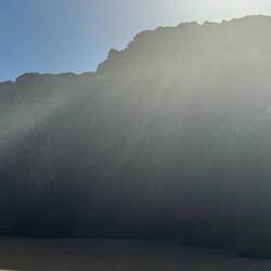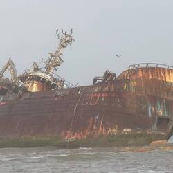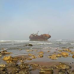 Mit viel Wasser, noch bereits im Chälli und Wasser im Gepäck, mache ich mich auf, um das Schiffswrack bei Tageslicht zu sehen. Die Tide ist low und das Schiff liegt von der tief stehenden Sonne und dem Nebel in diesem diffusen Licht. Es sieht einzigartig aus. Da ich schon so viele und sehr coole Schiff-LP‘s in Griechenland gesehen habe, wirkt es nur im Vorbeigehen magisch auf mich.