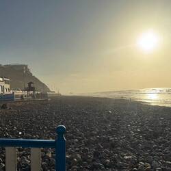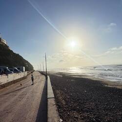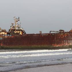 Trotz der bereits eingebrochenen Dämmerung, möchte ich noch einen Blick erhaschen und gehe dazu auf die ebenfalls neue Promenade links hinunter, bis sich das Schiff direkt vor mir am Strand zeigt. Außer ein paar Hunden begegne ich nichts und niemanden.