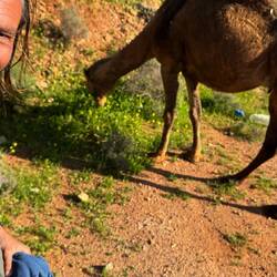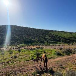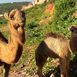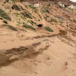 Ganz oben steht ein älterer Mann, dem ich zuwinke. Er winkt zurück und bewegt sich langsam nach unten. Er scheint schon etwas älter, mit einer krassen Lederhaut und unfassbar vorstehenden Unterzähnen, aber irgendwie sehr hübsch und authentisch. Er kommt zu mir hin und spricht mich mit arabisch an. Mit dem Handy übersetze ich etwas und er nimmt einen Stock auf, geht zu dem Tier mit dem ganz jungen und beginnt es mit dem Stock zu hauen. Das Tier macht tief brummende und schnaufende Geräusche und man merkt richtig, wie der Opa das Muttertier nervt. Ich überlege noch und hoffe nicht, dass der Opa die jetzt zu mir hintreiben möchte, da ich ihm gesagt habe, dass ich noch nie so ein Tier in der freien Wildbahn erlebt habe. Die Mutter beschützt sichtbar ihr kleines, aber der Opa schiebt das Kleine in meine Richtung, was bedingt funktioniert. Das Kleine fängt auch an zu quieken, weil es eigentlich nicht möchte.
