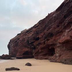 Nun werde ich doch mal besser ein Blick auf das Handy, anhand dessen ich erkenne, dass der Cache wohl draußen an irgendeiner Steinkonstruktion zu finden ist. Ich gehe wieder zurück, passiere wieder die Katze, die sich aufgrund des Schäferhundes wie ein Transformer in etwas größeres mit Buckel zu verwandeln scheint, links um die Ecke an der Wand entlang bis zu einem Wasserhäuschen. Ich gucke in ein Loch hier und ziehe ein Tuch aus einem Loch da, dann finde ich den Cache. Für das Beweisfoto gehe ich auf die Ecke vor, von der man wunderbar auf den Strand herunterblicken kann. Ich nehme meine typische Cache-Sieger-Beweisfoto-Pose ein und lass die Kamera vom IPhone auslösen. Die schwarze kleine Dose ist schnell wieder in der Wand verstaut und ich gehe zurück zur Treppe. Dort schaue ich noch einmal von der anderen Seite hinunter zum Strand und will m dann die Treppe nach unten nehmen, als mir drei junge Frauen den Weg versperren. Ich sage freundlich hi und zwei von drei grummeln sich irgendwas aus ihren nicht vorhandenen Bärten zurück. Runter ist die strebe aber nun wirklich mit Vorsicht zu genießen, da sie doch sehr zerstört ist.