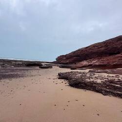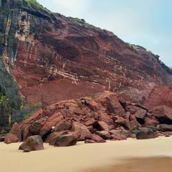 Besonders an der Nordspitze des Strandes fällt auf, dass der Sandstein auf einem Granitsockel ruht.