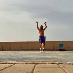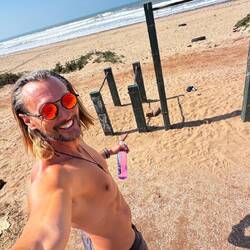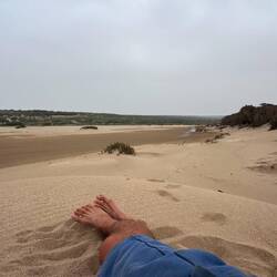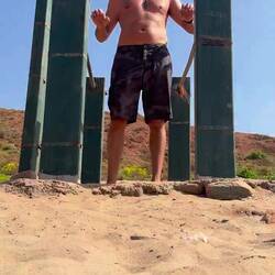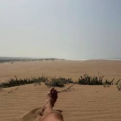 Auf dem Rückweg lege ich mich ein bisschen nackt in eine Düne, döse etwas und trainiere noch ein wenig auf dem Rückweg an dem Eisengerüst am Strand.