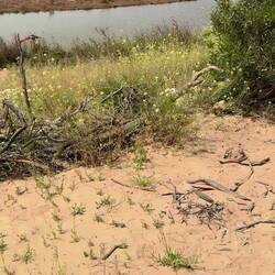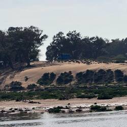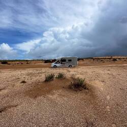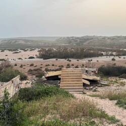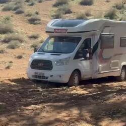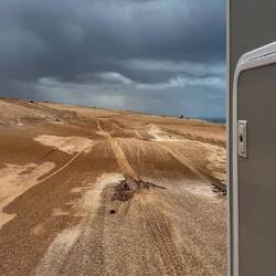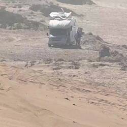 Als ein Kumpel mir schon anbietet, mich mit seinem Truck zu besuchen und mich das Ufer raufzuziehen, an dem ich jetzt schon 2x steckengeblieben bin, finde ich noch einen alternativen Ausweg auf die geteerte Straße, die machbar aussieht und die ich versuchen möchte. Der geschotterte Weg endete jedoch nur vor einem aufgehäuften Sand- und Schotterberg, vermutlich wegen der Militärstation, neben der ich ja festhänge.