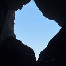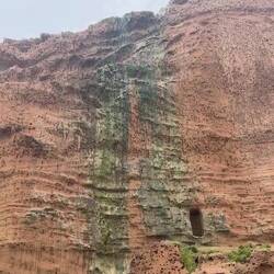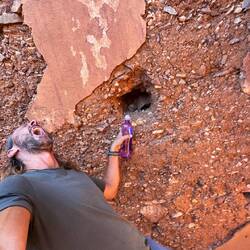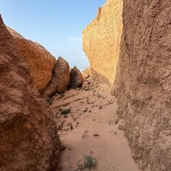 Nun durchschreite auch ich den Bogen und schaue nochmals genau das Sandgestein an, da ich verstehen möchte, ob es sich um roten Pelit, Sandstein selbst oder Konglomerate handelt oder eventuell eine Mischung. So oder so ist das Hämatit, was hier im Kitt enthalten ist, die Quarzkörner verschweißt und dem Gestein seine rote Farbe verleiht. Das lässt wiederum darauf hindeuten, dass die Landschaft hier so vor 100-150 Millionen Jahren so entstanden ist.