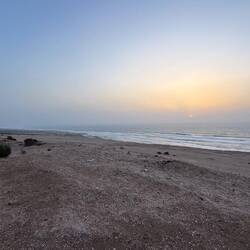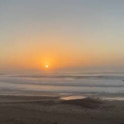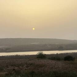 Plötz Hund wieder vor meiner Tür und will natürlich was fressen. Ich locke ihn kurz rein doch da er sich dabei nicht wohl fühlt, geht er wieder nach draußen. Es ist kalt und ich schließe die Tür. Setze mich nach vorne, um auf das Meer zu schauen, während ich auf dem Handy klicke. Die Sonne geht unter. Ein traumhafter Sonnenuntergang bietet sich über der Wüstenlandschaft. Und so kommt es, dass ich noch mal rausgehe, um Bilder zu machen. Abdoallah kreuzt wieder auf und erzählt mir nochmals vom Essen und das ich mit dem Auto mitkommen kann, was ich ihm ausrede.