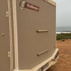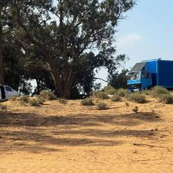Von der Straße aus, kurz vor der Brücke rüber nach Agadir kann ich deinen großen blauen LKW schon durch die Bäume schimmern sehen. Ich fahre zuerst über die Brücke, drehe im Kreisverkehr um und hoffe irgendwo eine Zugang zu dem schellende zu bekommen. Dem ist auch so. Es geht nur 1-2 Minuten den sandigen Weg entlang, bis ich vor einem Baum stehe, an dem ich nicht links die Offroadstraße vorbeifahren kann. Kurzerhand entschließe ich mich als rechts daran vorbeizufahren und bleibe nach wenigen Metern stecken, weil der Boden derart sandig ist. Keine Chance mit dem Chälli!