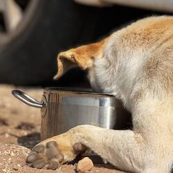 Doch zuerst füttere ich die Rasselbande von Hunden, die um ca. 07:00 Uhr an meiner Aufbautür auf mich wartet. Ohne zu überlegen stelle ich Ihnen meinen großen Topf mit den Reisresten vom Vortag hin. Der Jüngste fängt direkt an zu mampfen und wird dann von der Mama, die ihm hier den Vortritt gelassen hat, energisch aus dem Topf gedrängt.