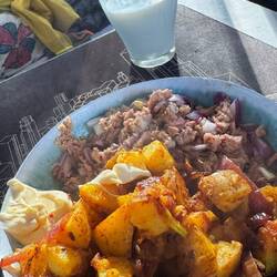 Dort mache ich mir erst mal vom Hunger geplagt ein paar schöne Bratkartoffeln marokkanischen Gewürzen und Gouda Käse in der gusseisernen Pfanne und dazu Oliven mit Kapern.