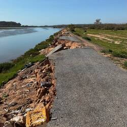 Nochmals versuche ich mit Schwung das Ufer hochzufahren, aber nein! Nachdem ich nochmals zum „Graben“ in der Straße fahre und überlege, ob ich diesen nicht mit großen Steinen und einer Schaufel wieder tauglich herrichten kann, fahre ich ein Stück zurück und habe eine mit Muscheln bedeckte Straße im Hinterkopf, wo ich vermute, dass diese weiter nach oben geht. Dem ist auch wirklich so, nur dass die Muschelstraße wieder in einen Weg mit nassem Sand übergeht und ich auch dort stecken bleibe.