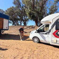 Mit Schwung umfahre ich den Baum und bleibe am Ende der Sandkuhle an der oberen Kante zurück auf den normalen Offroadweg stecken. Die hinteren Räder stecken tief im Sand und so kann der Frontantrieb auch nicht mehr viel ausrichten. Mit Spanngurt an Kevin seinen Truck ist das Problem sehr schnell gelöst und wir verabschieden uns voneinander.