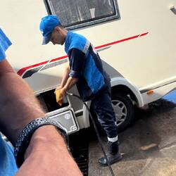 Ich Esse, bade in der Sonne, schmuse mit den Hunden, chatte auf dem Handy, ein sehr geiler chilliger Tag, als plötzlich ein Roller direkt neben mir hält, während ich in einer schwarzen Boxershorts auf der Yogamatte liege. Von der Sonne geblendet erkenne ich erst gar nichts, nehme mir die AirPods aus dem Ohr und sehe im Aufstehvorgang, dass der Mann den ganzen linken Fuß voll Blut hat. Er macht mir deutlich, dass er meine Hilfe benötigt und zeigt mir den Fuß, an dem sich ein abgerissener Fußnagel am großen Zeh befindet. Ich verstehe, dass er sich diesem der Kette des Mopeds abgerissen hat. Ohne zu überlegen gehe ich in den Shelly und hole aus der Klappe unter dem Kühlschrank erst eine größere und dann eine zweite kleine Verband. Axé, in der ich das nötige Material Zusammensuchen. Der Mann steckt seinen Fuß durch das Fliegengitter auf meine Fußmatte in den Wagen, so dass ich ihn vernünftig verarzten kann. Ich hohle noch Medien dazu und lasse es ordentlich unter den abgerissenen Fußnagel träufeln. Anschließend verbinde ich ihn den großen Zeh mit einer Mulde zu guter letzt nehme ich noch seine voll geblutet Tüten an, schmeiße diese in den Müll und versorge ihn mit einem neuen Gefrierbeutel, den wir mit einem Gummiband zum Schutz um den Fuß befestigen. Er ist sichtlich dankbar. Er zeigt mir nochmals, wie das Ganze passiert ist, und er ist wohl an dem Ständer des Mopeds hängengeblieben. Als er seinen Fuß auch nur in die Nähe bewegt, um es mir verständlich zu machen, bekomme ich schon einen halben Atemstillstand.