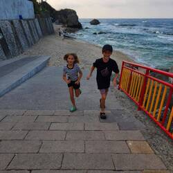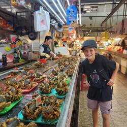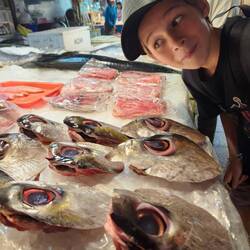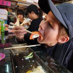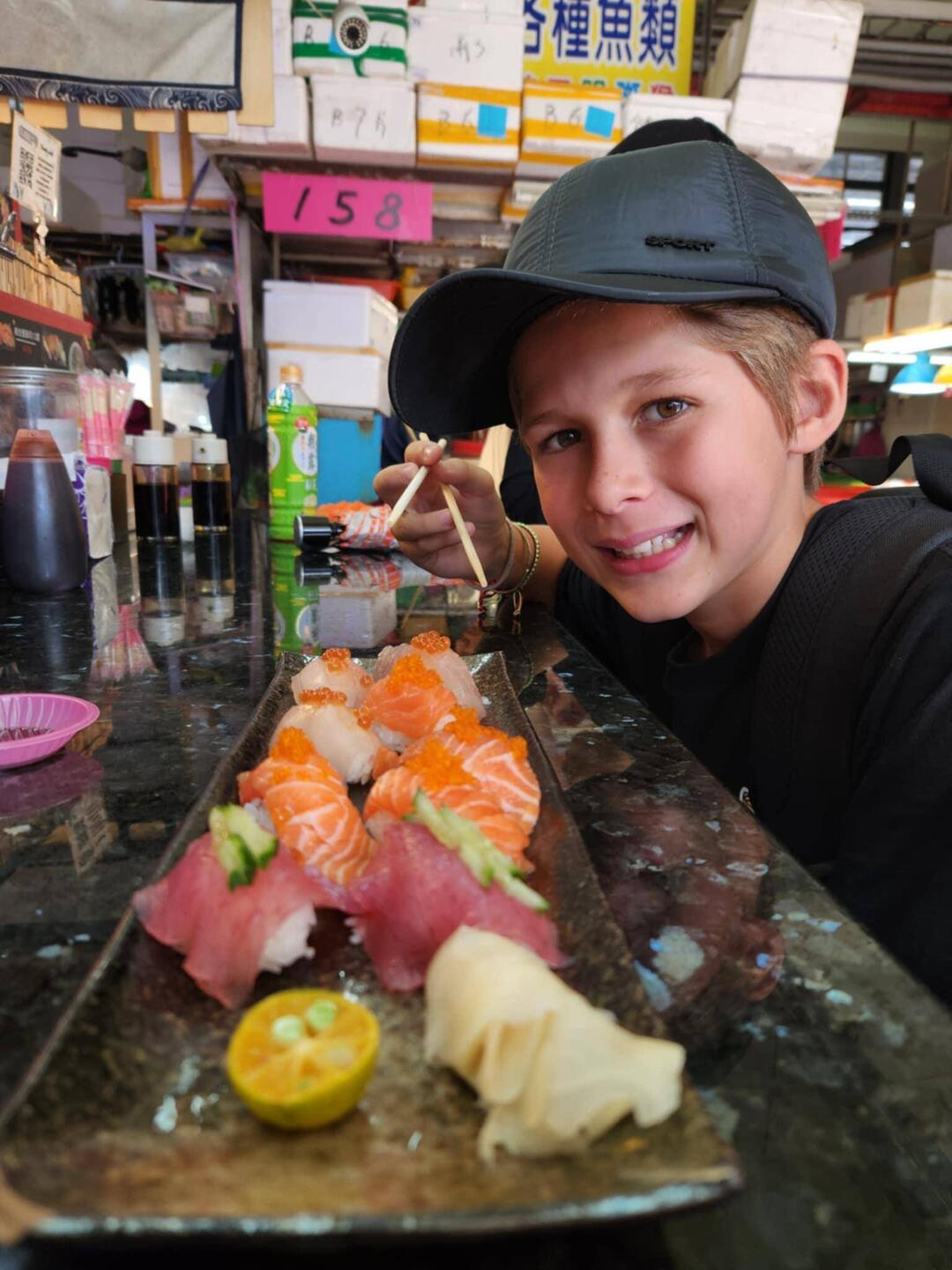 We drove to Donggang to catch a ferry but arrived a little early so we went to the fish market and I had some sashimi. I tried salmon and sailfish. The texture was a bit weird but it was very tasty. ILeia mais
