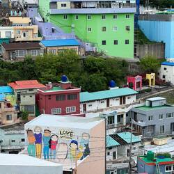 Gamcheon het einscht zumne Slum in Busan zellt. Doch dank ere Initiative vo Bewohner, Künstler und dr Lokalregierig het sichs zwüschezitlich in e Ahsammlig vo Kunstateliers, Geschäft und Wohnhüserもっと詳しく