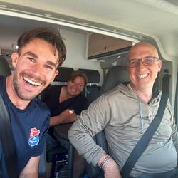 Ein Campervan aus Aachen stand plötzlich am Straßenrand 🚐. Tim fragte spontan, ob sie ihn ein Stück mitnehmen könnten – und die beiden waren sofort dabei. 30 Kilometer über den Berg, mit Blick aufs Meer, netten Gesprächen und viel Herzlichkeit. Wieder einmal eine dieser Begegnungen, die man nicht plant – aber nie vergisst.