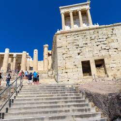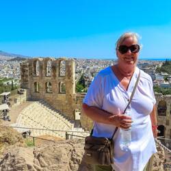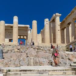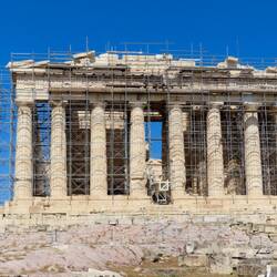Back on track now. The walkway up here is marble and very slippery, even when there is no rain! I am very careful of my footing because I’m not sure how they get a stretcher up here. The imposing structure behind me, otherwise know as the Parthenon it massive. You are not allowed inside it but you can walk around it. You have to wonder how the marble slabs were erected. I’m sure it is somewhere on Google. Built between 447 and 437 BC it stands almost 14 meters high and is 73 meter long and 34 meters wide. The columns are ‘slices’ of marble that are carved and then placed one on top of the other. It is not hugely busy when I’m there so I can take my time and wander back in my mind to flowing robes, gold jewelry and educated people wandering around doing their day-to-day business.