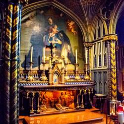 Okay, rant done. The church is beautiful. Part of the outside is undergoing restoration and is blocked off but the inside is not. Construction started in 1824 and finished in 1829. Built in the Gothic style with two large towers that were meant to been seen all over Montreal. Unlike other cathedrals in the world the stained-glass windows here do not portray storied from the bible. Instead, they portray the religious history of Montreal. The pipe organ has 4 keyboards and 7000 pipes. That would sound beautiful! (Thank you, Wikipedia for the info). The wood carvings are very intricate and even extend to the pews. The pulpit is called the Pulpit of Truth and is comprised of Old Testament and New Testament symbolism. It is exquisite up close. The high altar seems to have a celestial glow surrounding it. The pictures just don’t do it justice. As you meander your way through the aisles you can see the different statues and side altars, I came across one painting that caused me to pause and think for a moment. It is of a nun and two children as she is teaching them the ways of the Roman Catholic church. The reason it made me pause is that the children are clearly Native Indians of the area. The thought that crosses my mind is whether these children were willing participants. Their facial expressions lead me to believe not so. It makes me wonder, with all that has been discovered the last couple of years with the children of Native Indians being abused and killed, whether we had a right to impose our beliefs on another race. Just my opinion and you are free to have your own. I take time to pray and thank God for all the blessings in my life. Way too many to list here! I light a candle for the loved ones I have lost. Also, way too many to list here.
