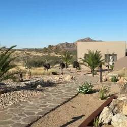die Lodge, Pool und OKF mit Middach im nächsten Dorf 😀 beim Gang aus der Rezeption überraschend auf Strauße gestoßen!