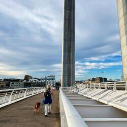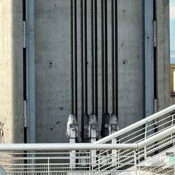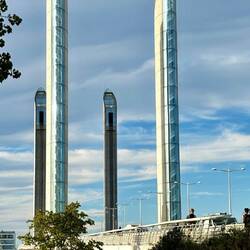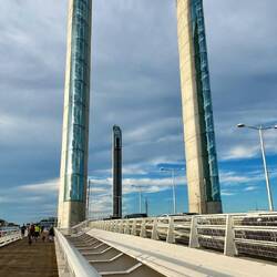 Eine beeindruckende Brücke deren Mittelteil für Kreuzfahrtschiffe angehoben werden kann.