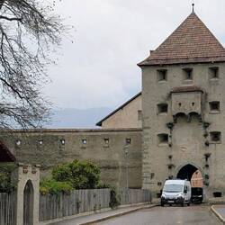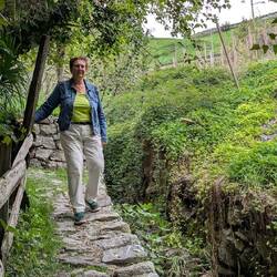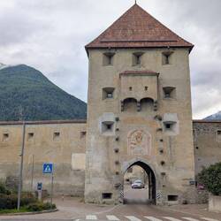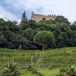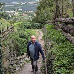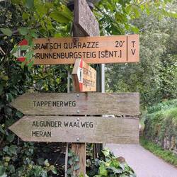 In Dorf Tirol erreichen wir über den Schlossweg den Aussichtspunkt auf die Brunnenburg und Schloss Tirol. Spontan entscheiden wir uns, weiter runter nach Algund zu wandern. Zuerst geht es steil dieBaca lagi