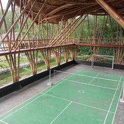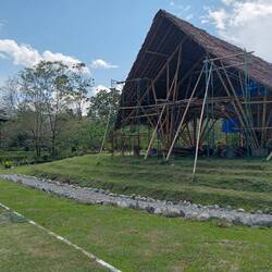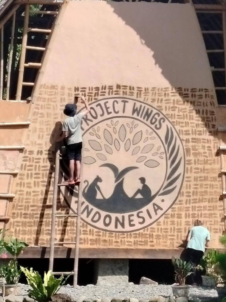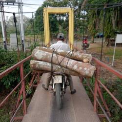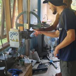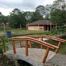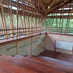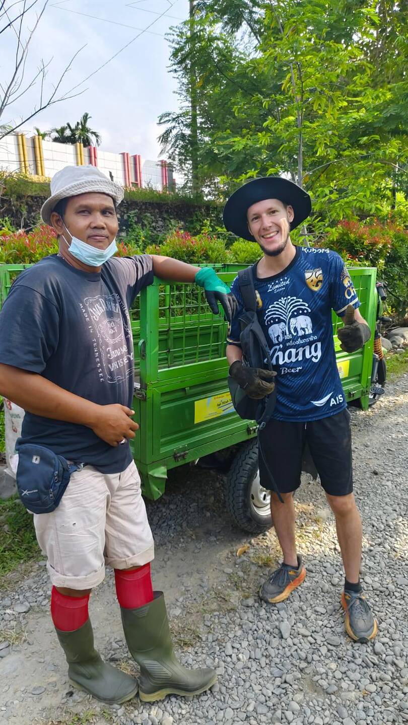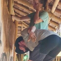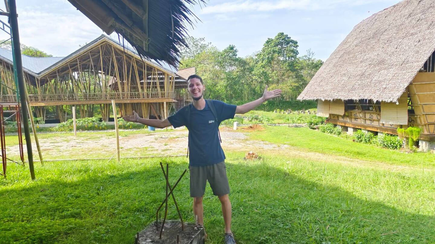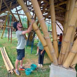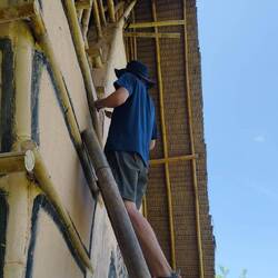Ce matin, après le meeting habituel de début de semaine, j'aide dans la construction du futur marché. Je lave et ponce les bambous. Mon acolyte de travail : Julia 🎍