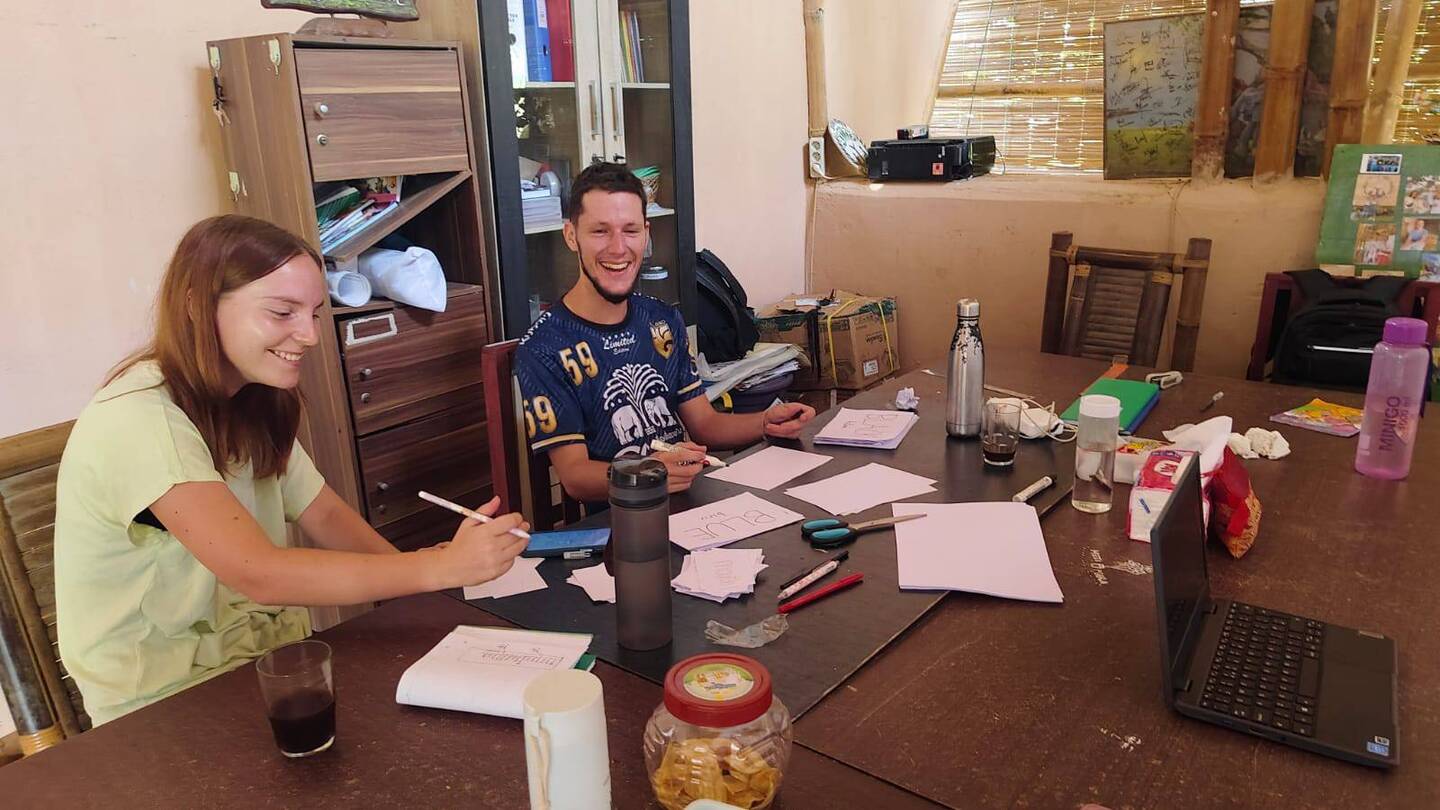Aujourd'hui, j'aide des enseignants (Mala, Ema, Tekno) dans la préparation d'un cours d'anglais pour des enfants. Je suis accompagné d'Elisabeth, une autre volontaire.