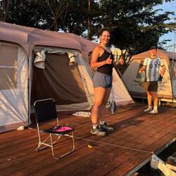 Um 6:20 aus den Federn und etwas Yoga. Mit einem sehr schönen Blick auf den See. Es gibt schlimmeres! 😉 Als die Sonne etwas über die Spitzen der Bäume kam, konnte man ihre Kraft deutlich spüren.