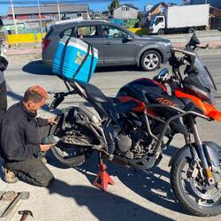 In Puerto Montt am Flughafen angekommen hat mich Hernan zu meiner Überraschung mit seiner 300ccm Maschine abgeholt. Alles in meinen Rucksack, ging das BauchtrainingBaca lagi