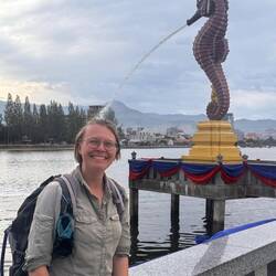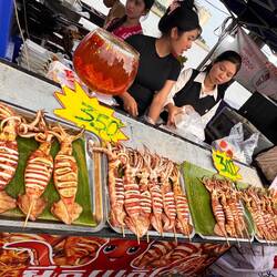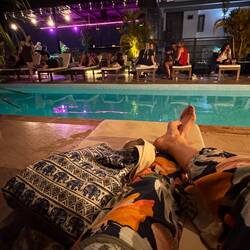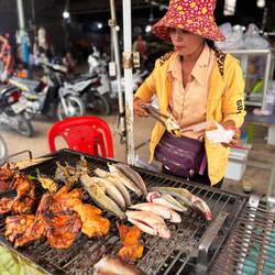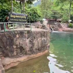 Morgens ging es mit Sarah und ihrer Familie nach einer Stunde Fahrt im Tuk Tuk nach Kep. Direkt zum Strand und die Kids spielten im Wasser bis die Kleider komplett nass waren. 😁 Mein erster Sand bei dieser Reise in Asien! Im Anschluss ging es das Mittagessen einkaufen. Dafür hielten wir bei einem Markt und kauften unterschiedlich große Calamares und einen Fisch. Wir packten alles ein und fuhren an sogenannten Salzgärten vorbei bis zu unseren „Hängematten“ für den Mittag. Wie ich es von Samnang und seinem Team schon gewohnt war, machten wir bei einem der vielen „Rastplätze“ halt. Dabei konnten wir an einem Tisch unser mitgebrachtes Essen verzehren und bestellten noch eine Kleinigkeit. Zur Verdauung legten wir uns in die Hängematte, bis die großen Hitze vorüber war. Die Karawane zog dann Nordwestlich von Kampot.☺️ Dort sollte ich einen Wasserfall bestaunen dürfen, jedoch war davon nicht viel zu sehen. Aktuell ist die Trockenzeit, weswegen ein Becken nur zum schwimmen genutzt wird. Ich fand es dennoch recht interessant, wo anders sein zu können und die Menschen zu beobachten. Die Kleinen hatten ihren Spaß und ich durfte wieder Früchte probieren wie das Obst des Rambutan Baums, welcher mit dem Litschiebaum verwandt ist. Was ich jedoch nicht sonderlich schön fand war der kleine „Tierpark“. Bis auf die Löwen, Schlangen und Krokodile, war jedes Tier, wie Affen, Vögel einzeln gehalten worden. Eine der Löwinen brüllte bevor wir gingen. Hier hat man die volle Kraft dieser Tiere zu spüren bekommen und gleichzeitig war es ein trauriger Anblick. Nun rollten wir in die Stadt, meine Absicht war ein kleines Abschiedsgeschenk für Nykas Mutter zu kaufen, als Dankeschön für die schöne Zeit. Mithilfe von Sarah fand ich eine Handtasche. Happy etwas kleines sinnvolles gefunden zu haben fuhren wir nachdem wir etwas am Fluss, dem Preaek Tuek Chhu, entlangliefen etwas außerhalb der Stadt. Es ging zu einem Touriplatz direkt am Fluss wo wir leckeren, gefüllten Reismehlpfannkuchen mit Kurkuma gegessen hatten. Dieser wird in Salat eingewickelt und in die Soße gedippt. Sehr zu empfehlen! ☺️