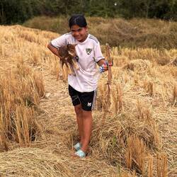 Kurz vor Sonnenuntergang zog ich dann mit Nyka etwas durch die Reisfelder. Sie wollte mir unbedingt eine schöne Stelle zeigen. Die Vierbeiner wollten dabei ebenfalls unbedingt mit. 😁 Ganz wohl fühlte ich mich allerdings nicht wirklich beim betreten der Felder. Landminen gab es immer noch. Sie sollen sich eher in den Grenzregionen zu Vietnam oder Thailand befinden, aber wissen tun man es ja nie. Ich lief deswegen immer dort wo sich Traktorspuren befanden. Als Sie untergegangen war saßen wir noch etwas auf der Dachterasse und genossen den Wind.