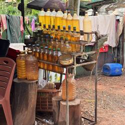 Am Flughafen wartete Samnang schon. Er hatte ein Bild von mir aus Couchsurfing gemacht um und ich erkannte ihn irgendwie so. Wir begrüßten uns herzlich und dann ging die Fahrt zu ihm aufs Land los. Ich wurde mehrfach gefragt ob ich Hunger hätte. Letztendlich bekam ich ein Becher voll mit Zuckerrohrsaft mit Eis, ein Sandwich und ein Hühnchenstick überreicht. Alles hatte er an einem Straßenimbiss gekauft. Es schmeckte alles sehr lecker, gespannt war ich nur wie ich es vertragen würde. Die Regel war ja keine Eiswürfel, am besten alles sehr heiß essen und Wasser nur aus frisch geöffneten Flaschen trinken. Ich war noch keine zwei Stunden hier und verstieß gegen fast all diese Tipps. 😂