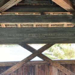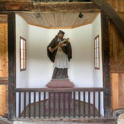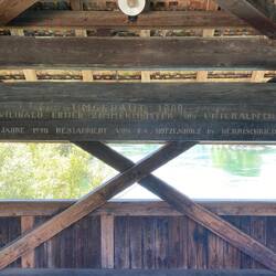 Das Satteldach ist mit Biberschwanzziegel gedeckt. Auf dem von Säckingen her zweiten Pfeiler ruht auf beiden Flussseiten je eine kleine polygonale Fachwerkkapelle, deren oberseitige eine farblich gefasste Figur des heiligen Franz Xaver enthält; auf dem vierten Pfeiler ruht oberseitig ein weiteres mit Pultdach versehenes Kapellchen, in dem sich eine barocke ebenfalls farbig gefasste Figur des „Brückenheiligen“ Johannes Nepomuk befindet.Read more