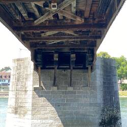 Zwischen 1960 und 1963 wurden die alten gemauerten Pfeiler durch tiefer gegründete, mit Naturstein verkleidete Betonpfeiler ersetzt, da durch den Kraftwerksneubau in Bad Säckingen der Wasserspiegel um mehr als drei Meter sank und die Flusssohle vertieft wurde. Im Jahr 2014 wurde im Rahmen einer Sanierung bekannt, dass die steinernen Brückenpfeiler bis in den Oktober 2014 dauerhaft mit Sprengstoff bestückt waren. Die Schweizer Armee hätte so im Verteidigungsfall nur Zünder einsetzen müssen, um die Brücke zu sprengen. Zuletzt war eine Sprengladung von vermutlich mehreren hundert Kilogramm TNT in die Brücke verbaut.