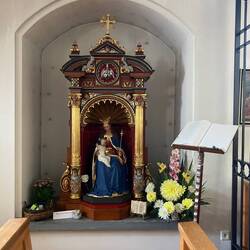 Ein erstes Gotteshaus wird im 7./8. Jahrhundert vermutet. Der schlanke Kirchturm lehnt sich an das stattliche, spätgotische Kirchenschiff. Die Westwand des arkadenförmigen Vorbaus zieren innen undLæs mere