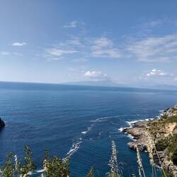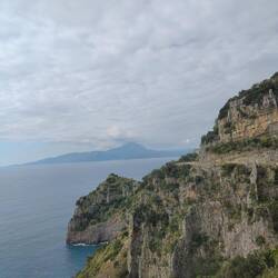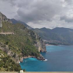 Wir fahren durchs Cilento, eine Ebene mit Gemüse und Büffelmozzarella Produktion. Dann geht's hinauf in die Berge, und schon sind wir an der Steilküste! Traumhaftes Panorama in alle Richtungen,Lue lisää