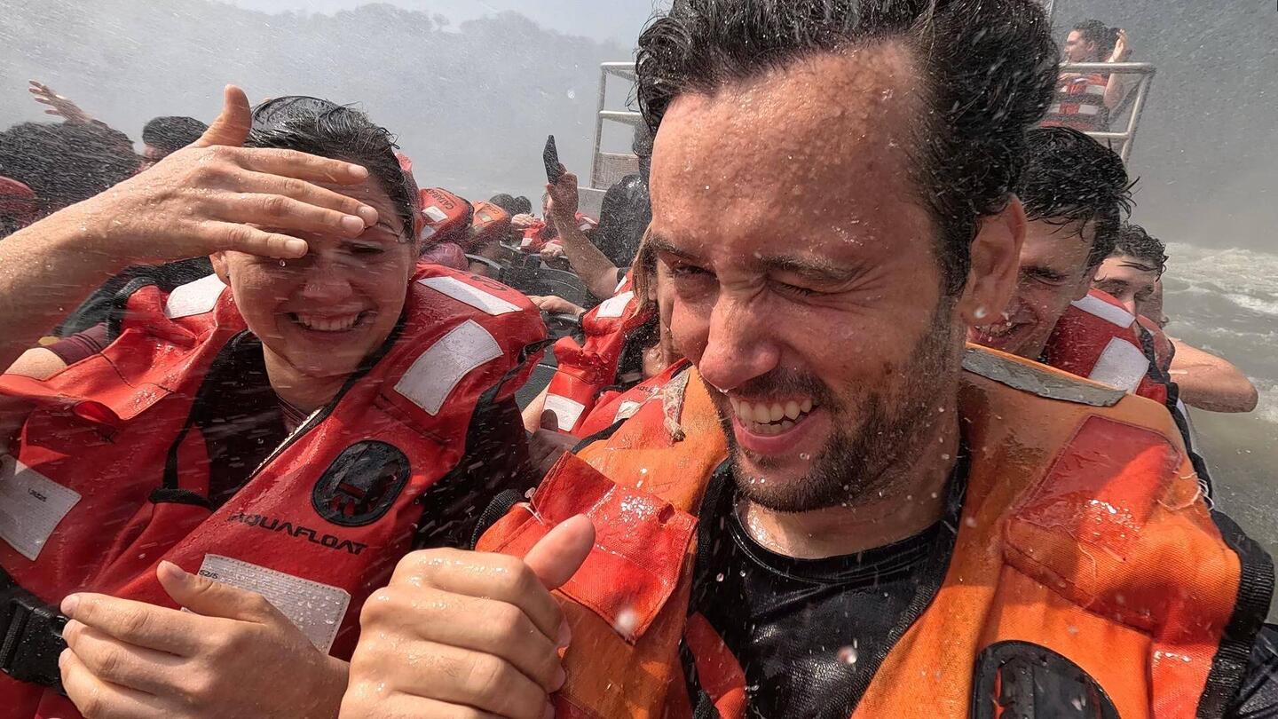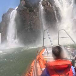 Neuer Tag, neues Glück! Am Taxistand treffen wir ein nettes Paar aus Argentinien, mit dem wir uns ein Taxi teilen. Die Argentinierin will heute zum dritten Mal mit dem Boot fahren, was uns anhand des happigen Preises (mehr als 50€/Person) etwas überrascht. Die Bootsfahrt wird es dann wohl wert sein. Wir folgen ihr zum Verkaufsstand und bekommen direkt ein Ticket! Also ab in die Badesachen, alles wasserdicht verstauen und los geht es! Nach einer halbstündigen Busfahrt durch den Wald kommen wir am Bootsanleger an. Uns kommen klatschnasse Leute entgegen, die glücklich grinsen. Wir werden mit Schwimmwesten ausgestattet und nehmen Platz. Auf der Fahrt zu den Wasserfällen peitscht uns der Fahrtwind ins Gesicht und Andi wird bereits ein bisschen nass. Unsere Crew zieht sich inzwischen wasserfeste Ganzkörperanzüge an...