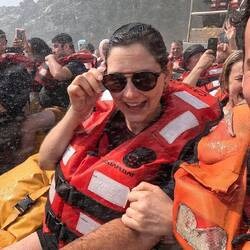 Wir steuern direkt auf einen Wasserfall zu und fahren etwas hinein. Wir lachen und streichen uns die Wassertropfen aus dem Gesicht. Dann dreht der Kapitän um und holt Schwung... und fährt dieses Mal komplett in den Wasserfall! Wasser donnert aus allen Seiten auf uns herab und durchnässt uns völlig. Eine Taucherbrille wäre jetzt praktisch! Alle schreien und lachen begeistert, als der Kapitän das Spiel noch bei zwei weiteren Wasserfällen wiederholt. Das macht super viel Spaß!!
