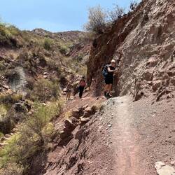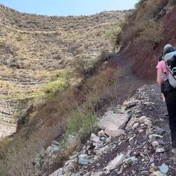 Es gibt eine zweitägige Wanderung, die uns von einigen Backpackern in Sucre empfohlen wird: über einen alten Inka-Weg bis in einen verloschenen Vulkan, vorbei an Dino-Spuren bis in ein kleines Dorf. Das wollen wir uns nicht entgehen lassen. Die Informationslage ist dabei ziemlich dünn. Von einer Deutschen wird mir eine fragwürdige Wegbeschreibung zugeschickt (Zitate: "[...] wenn du die Schafe siehst rechts gehen [...]" und "[...] dann kommt ein Erdrutsch, der gefährlich aussieht, aber ziemlich sicher ist [...]"). Von einer Belgierin bekomme ich eine französische Seite geschickt, auf der eine Route auf einer Karte eingezeichnet ist, die aber nicht so wirklich zum Text der Deutschen passt. Tanja tut ihr Bestes und erstellt eine Route auf Komoot, die anstrengend, aber immerhin begehbar aussieht.