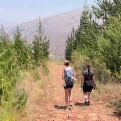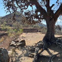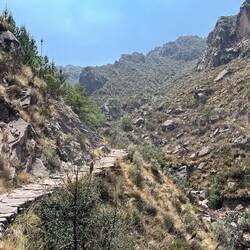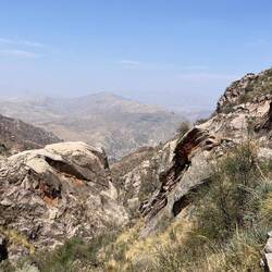 In der prallen Sonne klettern wir Hügel hinauf und hinab, bis wir an besagtem Erdrutsch ankommen. Der sieht tatsächlich gefährlich aus, und als Tanja probehalber einen Fuß auf den Weg setzt, rieseln viele kleine Steinchen nach unten - beängstigend, vor allem mit dem schweren Rucksack auf dem Rücken! Andi traut sich bis zur sicheren Mitte und spricht Tanja gut zu, sodass sie es ebenfalls unbeschadet schafft. Währenddessen entscheidet sich die Französin, dass das zu gefährlich ist, und verschwindet aus unserem Blickfeld, um die Stelle über uns auf einem anderen Weg zu umklettern. Das finden wir gar nicht gut, aber es ist nunmal ihre Entscheidung. Die sportliche Belgierin hat bei uns gesehen, dass alles gut ging, und überquert die Stelle ganz entspannt. Die zweite Hälfte des Erdrutsches ist flacher, und so kommen wir gut an Ende an. Die Belgierin sehen und hören wir nicht und machen uns daher ziemliche Sorgen. Inzwischen sitzt am Anfang des Erdrutsches ein riesiger schwarzer Hund. Plötzlich erscheint die Belgierin tränenüberströmt hinter dem Hund - sie hat keinen besseren Weg gefunden, um zu uns zu gelangen. Mit der Kraft der Verzweiflung drückt sie sich an dem Hund vorbei und überquert schnell den Erdrutsch. Puh, Gott sei Dank hat alles geklappt! Mental und körperlich war das alles ziemlich anstrengend.