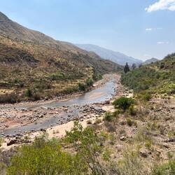 Dann geht es Offroad, und über kleine, oft kaum erkennbare Wege legen wir die nächsten flachen (juhu!) 5 km entlang eines Flusses zurück. Die Ausblicke auf die vielfarbigen Berge sind dabei unglaublich!! Wir gelangen an eine wackelige, schräge Brücke, die wir lieber nicht alle gleichzeitig überqueren. An deren Ende wartet ein Einheimischer auf uns, der einen inoffiziellen Wegezoll verlangt. Wir fügen uns und stapfen weiter.