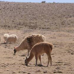 Nach dem Mittagessen in dem winzigen Dorf Polulos mit der einzigen Schule in der Umgebung fahren wir weiter. Am Wegesrand sehen wir Vicuñas, die wilde Form der Llamas. Die Tiere sind wesentlich dünner und schreckhafter als ihre domestizierten Cousins, aber wunderschön. Sie sind vom Aussterben bedroht und daher geschützt, aber durch illegale Jäger bedroht: für ihr weiches Fell liegt der Marktpreis bei 500$/Kilo, sodass ein Pulli aus Vicuña-Wolle 3.500-5.000$ wert ist. Das weckt in dieser armen Region verständlicherweise Begehrlichkeiten.
