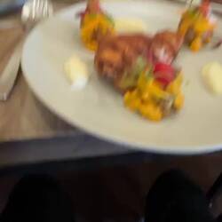 - In einem Restaurant genießen wir ein elaboriertes Mehr-Gänge-Menü inklusive Blumendekoration auf dem Dessert.