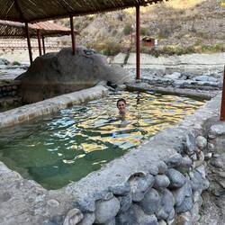 Dann kommen wir zu einer Reihe Hot Springs, die verschiedene Temperaturen haben. Wir arbeiten uns vom lauwarmen bis zum heißesten Pool vor, in dem wir es aber nur kurze Zeit aushalten. Es macht total viel Spaß, seine optimale Temperatur herauszufinden und in den Becken zu entspannen. Wir hätten auch die Option gehabt, mit einer Zipline über das Tal zu sausen, in dem die Pools liegen. Aber nach einem kurzen Blick auf den Zustand der Zipline entscheiden wir uns dagegen: In den wenigen Tagen in Peru haben wir schon Tanjas Handy und Andis GoPro verloren, unser Leben würden wir gerne behalten.