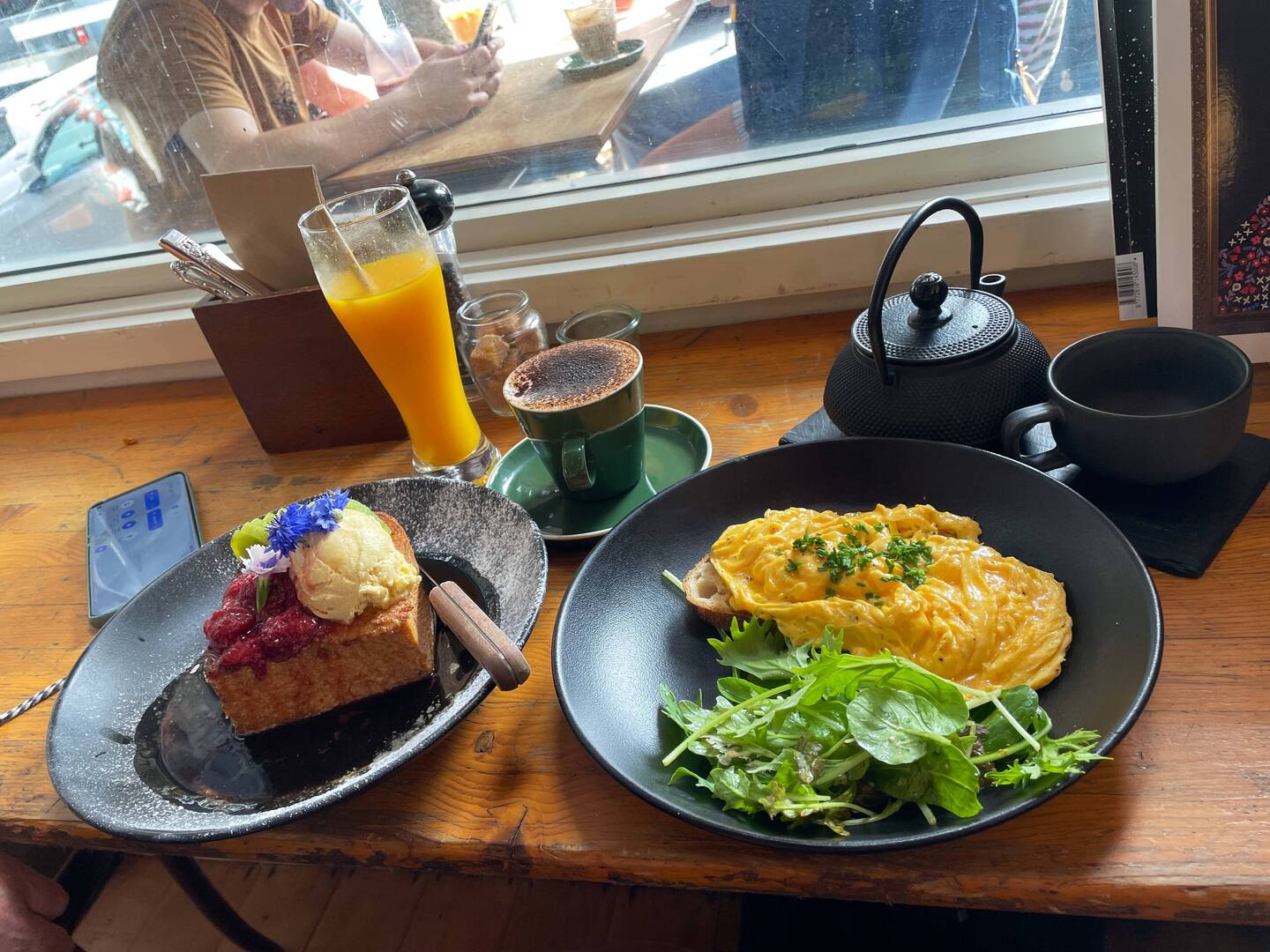 Lovely day pootling around the shops* in Auckland. Leisurely brekkie, then a short ferry ride to Devonport, where we were blown about by a brisk wind. Had hoped we’d escaped the wind when we leftBaca lagi
