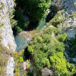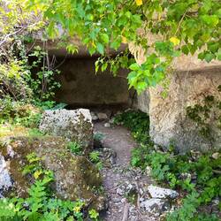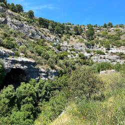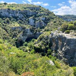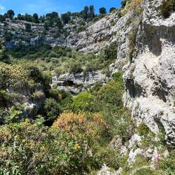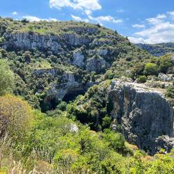 Der Fluss Anapo hat dort im Laufe von Jahrmillionen sich einen mehrere hundert Meter tiefen Canyon erschaffen. In der Bronzezeit war das der Lebensraum einer der frühen Kulturen Siziliens. Dort kann man die in den Stein gehauene Totenstadt sehen. Was für ein Kontrast zu dem Friedhof in Scicli 😀.