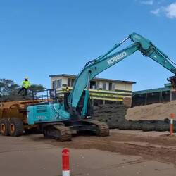 Am Strand wurde Heute den ganzen Tag gearbeitet, Strandverstärkung, da das MeerLeer más