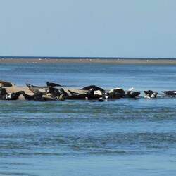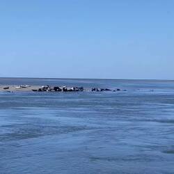 Wir konnten uns die Chance nicht entgehen lassen, die Robben noch mal am Strand liegend uns anzuschauen. Und tatsächlich! Keine 50m trennten uns und die Robben auf der Sandbank. Ein tolles Erlebnis!