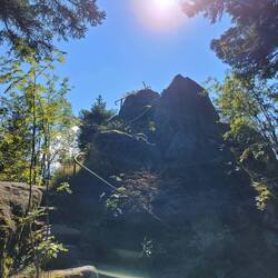 Heute ging es bereits um 07.30 Uhr los, da ich den langen Anstieg von Hausach hoch zum Farrenkopf nicht in der großen Hitze machen wollte. Kurz nach Burg Husen stießen auch schon Claus und Gunther mit dazu, sodass wir den Aufstieg gemeinsam bewältigten. Nach rund 1,5 Stunden standen wir auf knapp 800 hm und genossen bei einem Frühstück die Aussicht. Bald ging es weiter, denn das sollten noch nicht alle Anstiege heute gewesen sein. Es ging nochmal hoch zum Huberfelsen sowie zum Karlstein, zwei exponierte Felsformationen. An dem Gasthaus Schöne Aussicht machten wir eine Rast um die Energie bzw. Flüssigkeitsreserven wieder aufzufüllen. Nun war es nicht mehr weit bis zu meiner heutigen Unterkunft, dem Haus Silberberg kurz vor der Wilhelmshöhe. Dort angekommen, war ich wieder einmal sehr froh eine Dusche zu bekommen, da die hohen Temperaturen etwas schweißtreibend waren.