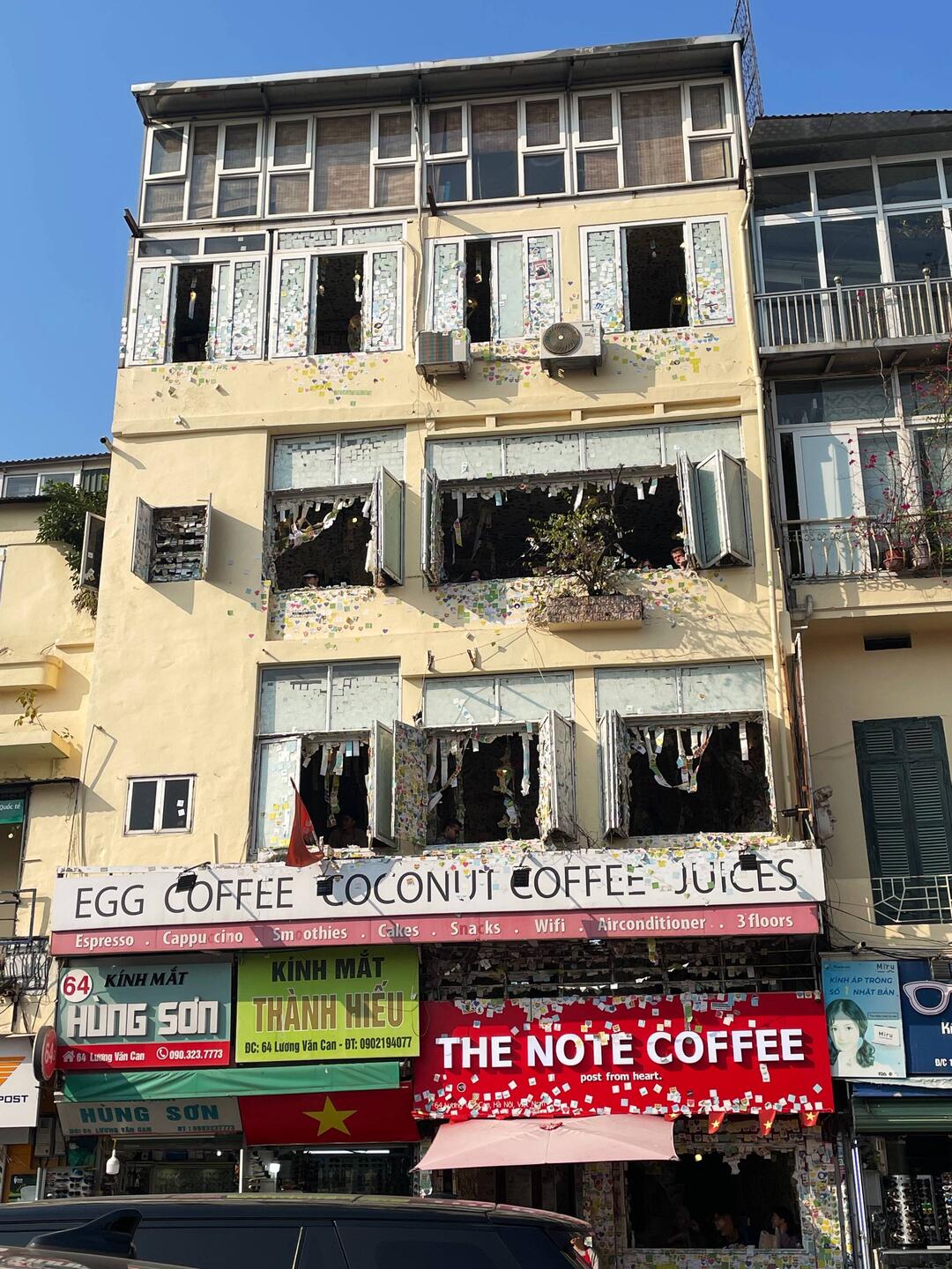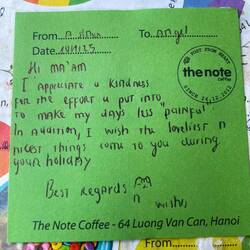 Für mich ging’s gleich ins Note Cafe, natürlich ein Internet Hotspot! Viele Liebeserklärungen kleben hier, auf schon bereitgestellten Zetteln, an: Vietnam, Hanoi, FreundInnen und überraschend viele an Mamas und Papas! Der junge Kellner, dem ich mein Ohr für seine Probleme schenkte, schenkte mir eine „Liebeserklärung“.