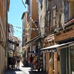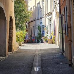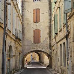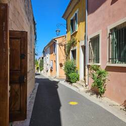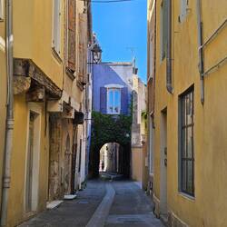Es ist eine kleine Stadt mit einem Kanal von der Rhone und einer alten Burg. Die Stadt ist ganz nett und total verschlafen. Heute mitten in der Woche sind kaum Geschäfte geöffnet (und Mittagspause ist noch nicht), die Fensterläden geschlossen und kaum Menschen auf der Straße (weder Einheimische noch Touristen). D.h. doch - der Straßenkehrer, der die gröbsten Dinge mit Kehrblech und Schaufel aufsammelt.